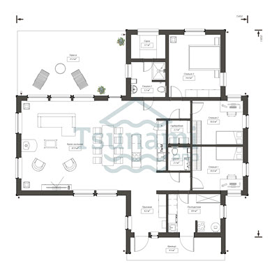 Интересный дом в современном стиле Т- образной формы. Дом реализован для постоянного проживания и подходит для семьи с детьми. Вместительная кухня гостиная со "вторым светом" в зоне гостиной, с выделенной обеденной зоной и выходом на террасу. Небольшая терраса под крышей с возможностью ее расширения. В доме есть кладовая, гардеробная, техническое помещение, а также 3 спальни и 2 санузла для удобства большой семьи.