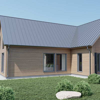 Стандартная фасадная облицовка - окрашенная на производстве фасадная доска с поднятым ворсом. Срок службы лакокрасочного слоя до 14 лет. Может быть заменена на любой другой фасад - от облицовочного кирпича и штукатурки до керамических панелей